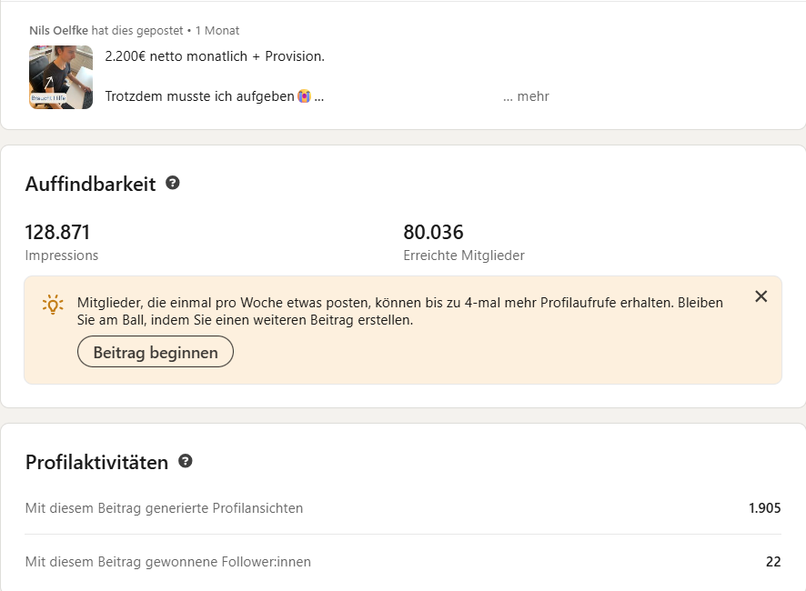 Mein erster richtig viraler LinkedIn-Beitrag hat 120.000 Impressionen erzielt und 75.000 Mitglieder erreicht. Extrem viele haben sich daraufhin mein Profil angeschaut, und ich habe dadurch zahlreiche neue Follower gewonnen.
